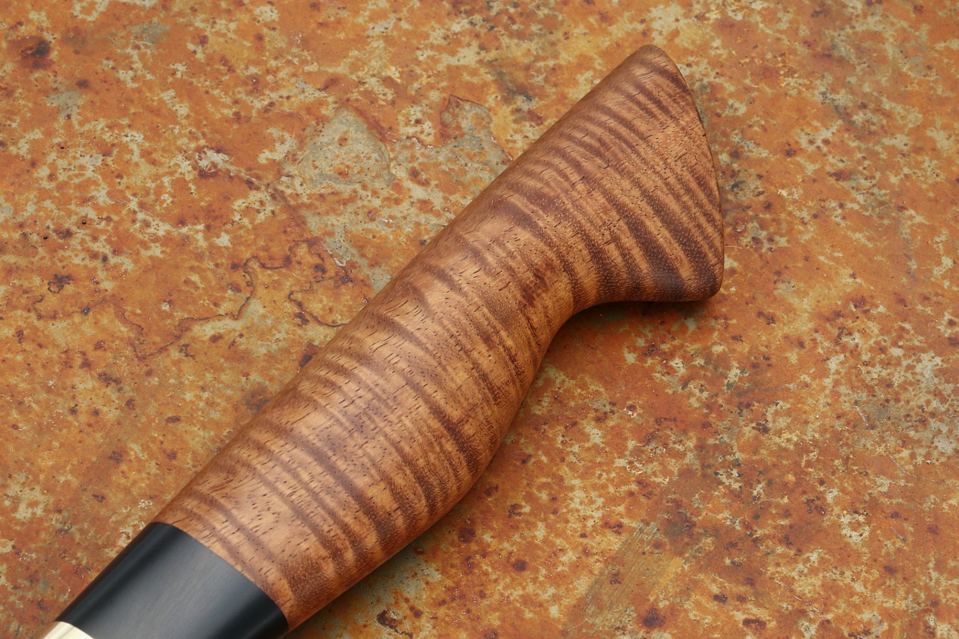 Messinki hela, micarta keskiosa ja stabiloitu sapotilla kahva. Kahvan kokonaispituus 143mm. Paino 220g.
