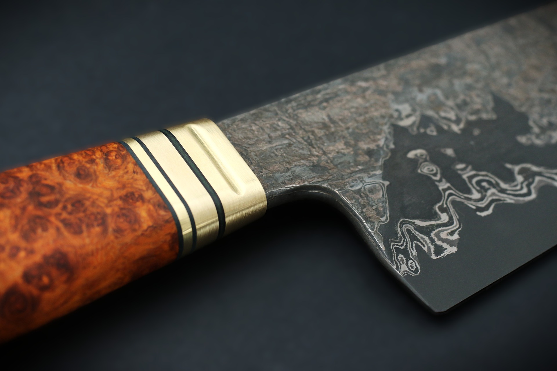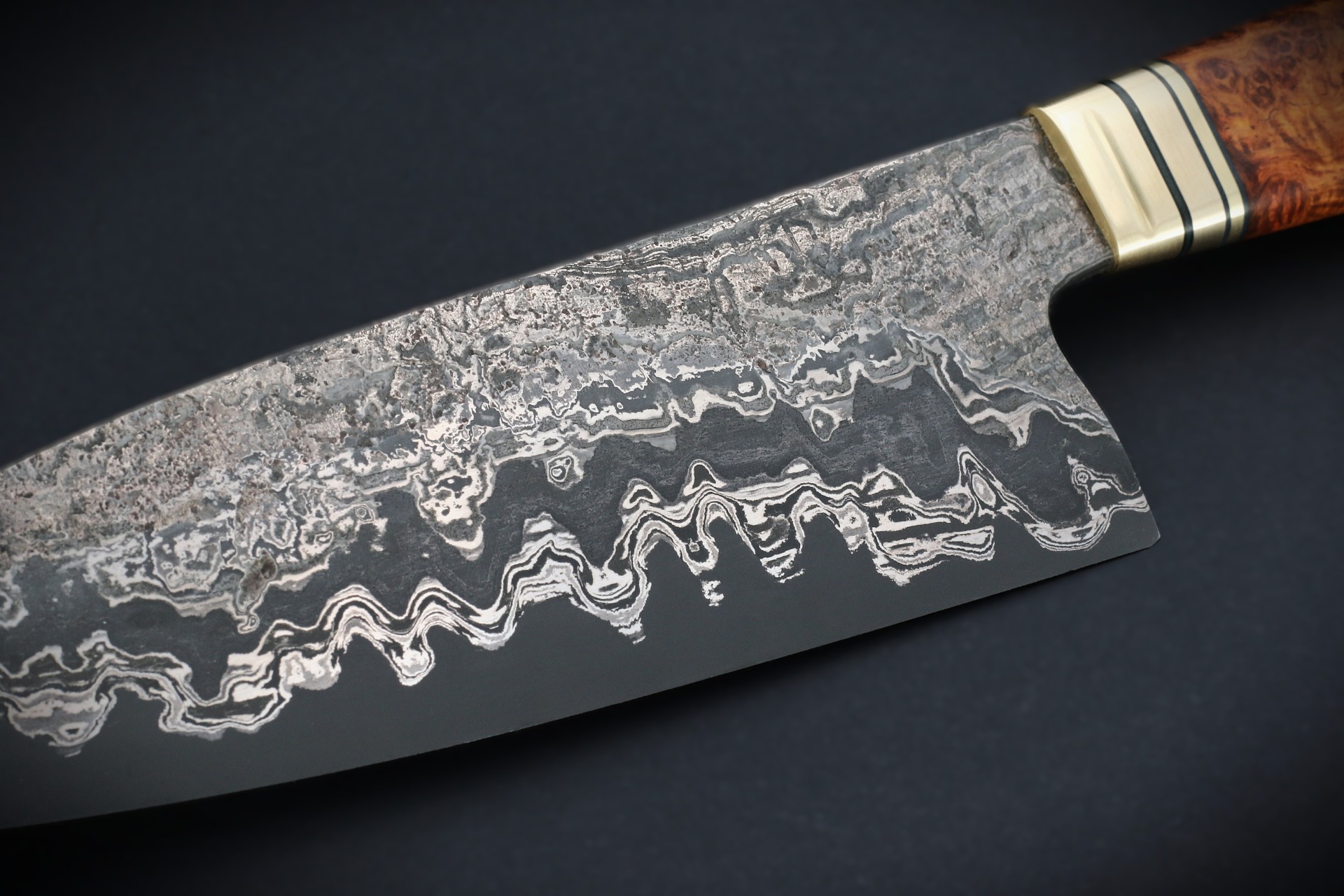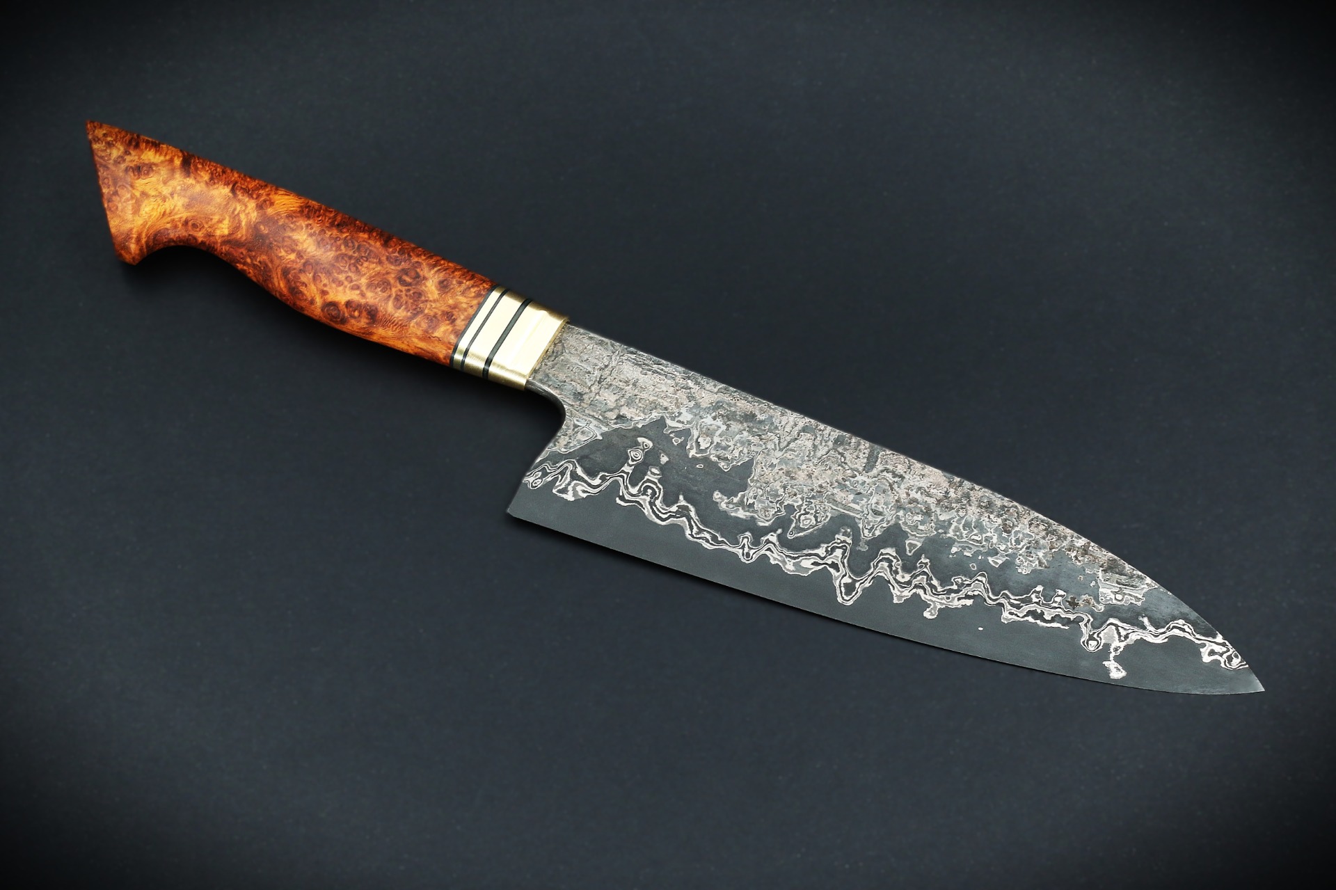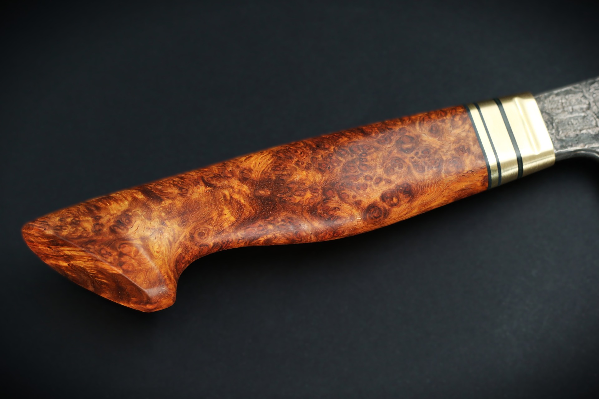 Blade 197 x 55 mm. Handle 142 mm. Weight 239 g. Brass and stabilized amboyna burl handle.